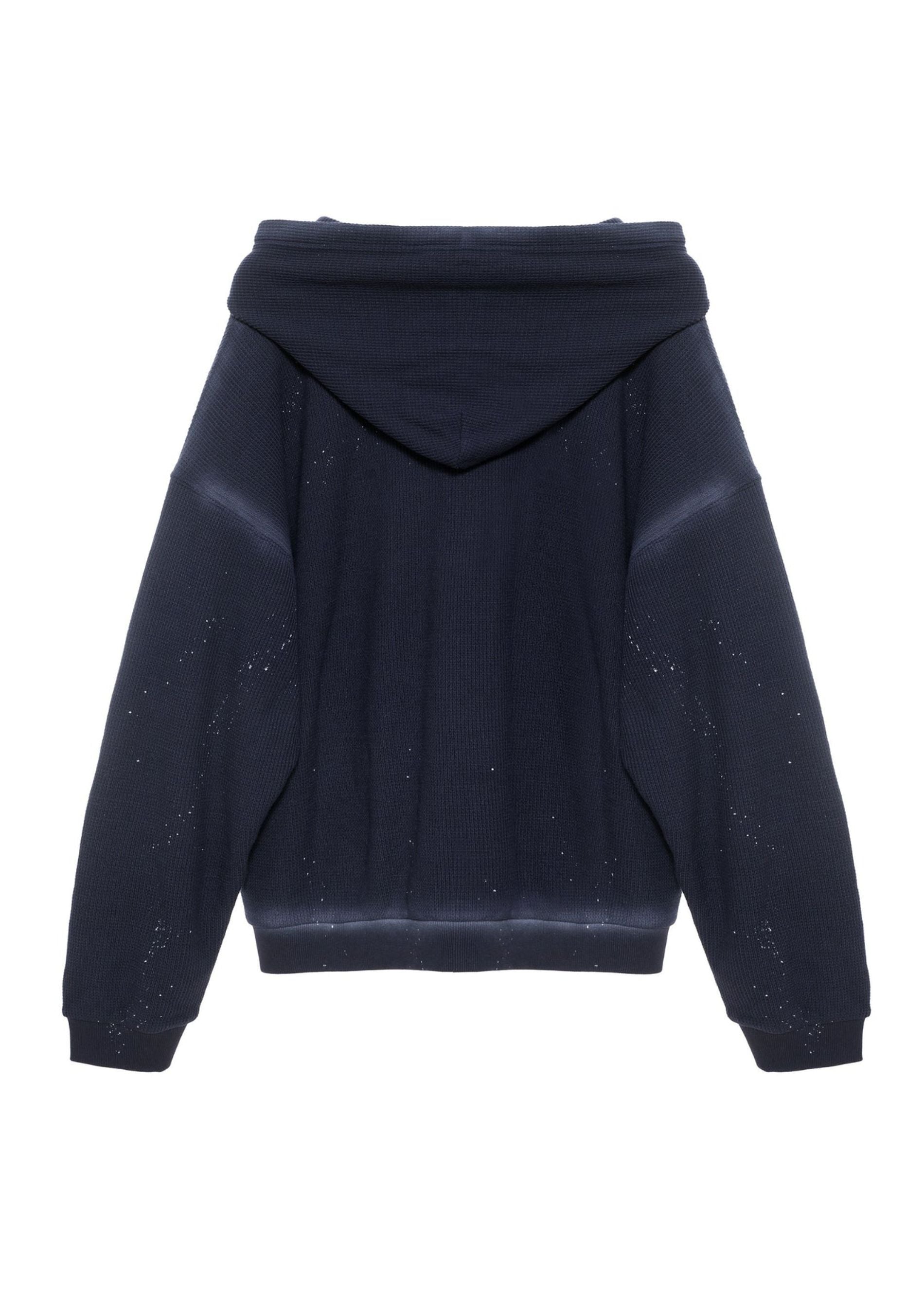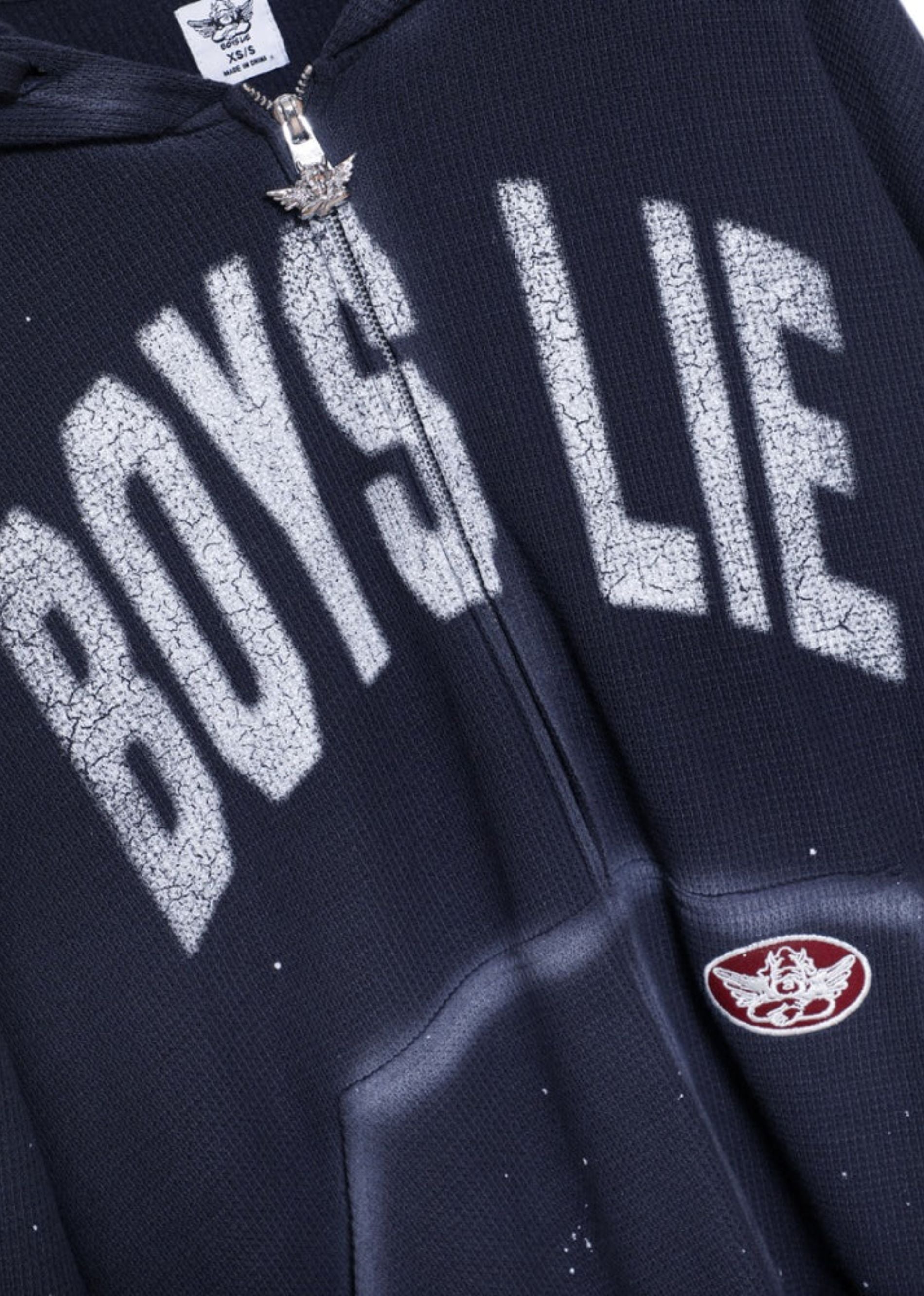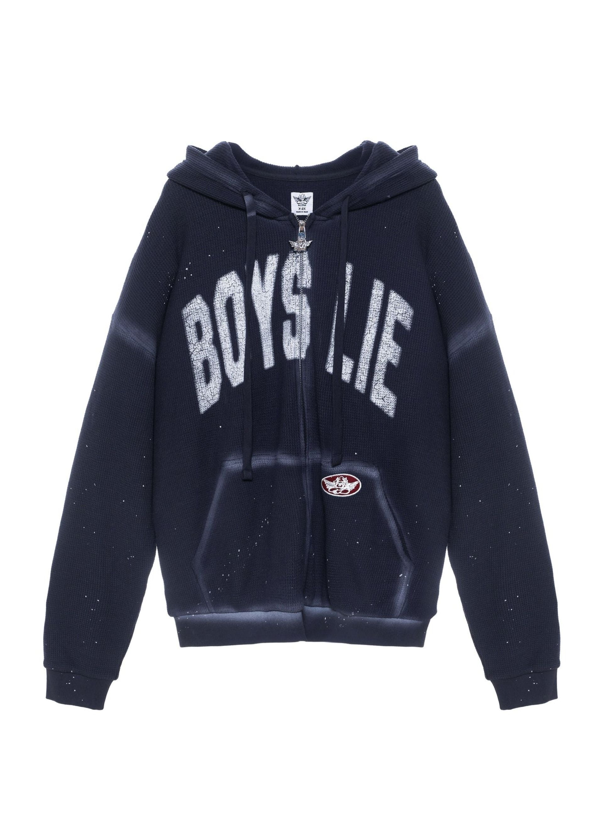 Laid-back with a lived-in edge. The Majoring In Moving On Harley Zip Up comes in a deep navy tone with subtle white splatters throughout, creating a perfectly distressed, worn-in look. A faded white Boys Lie print stretches across the front, while the faded seam detailing adds a touch of vintage flair. Cozy, cool, and effortlessly statement-making — this zip-up is everything we love about Boys Lie.
