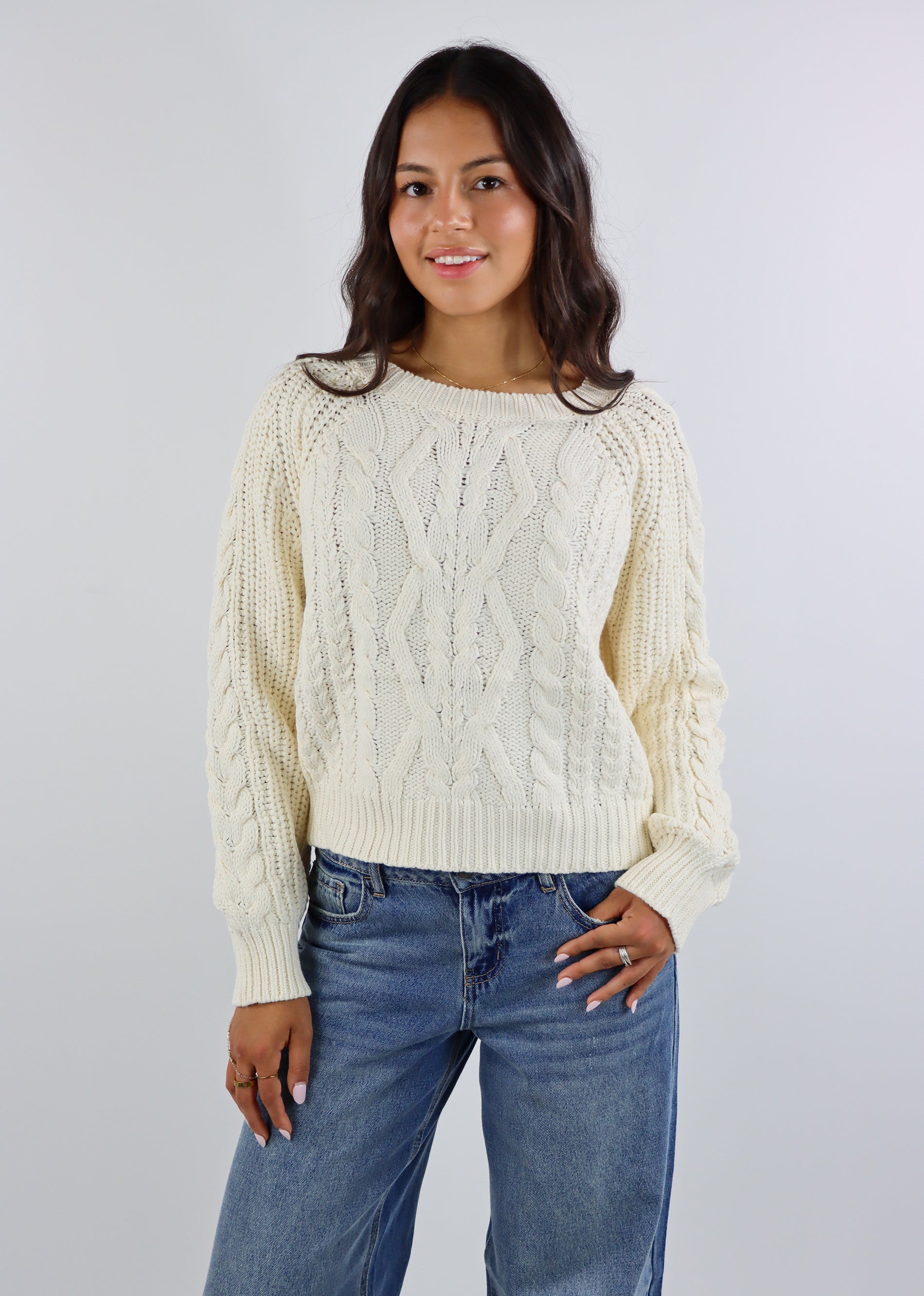 Straight out of your Pinterest board dreams, the Cable Knit Chunky Sweater is the ultimate cozy-meets-chic staple. Designed in a soft ivory cable knit with a crew neckline, this chunky sweater brings effortless style to cooler days. Pair it with a mini skirt and boots for a preppy vibe or keep it casual with your favorite jeans.