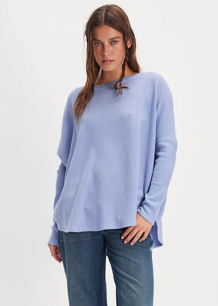 Your new go-to thermal. The Latte Blues Thermal Tee comes in a soft blue waffle-knit fabric with an oversized, slouchy fit that’s as cozy as it is cool. Designed with dropped shoulders and long sleeves, this laid-back essential pairs perfectly with jeans, sweats, or layered under a jacket.