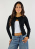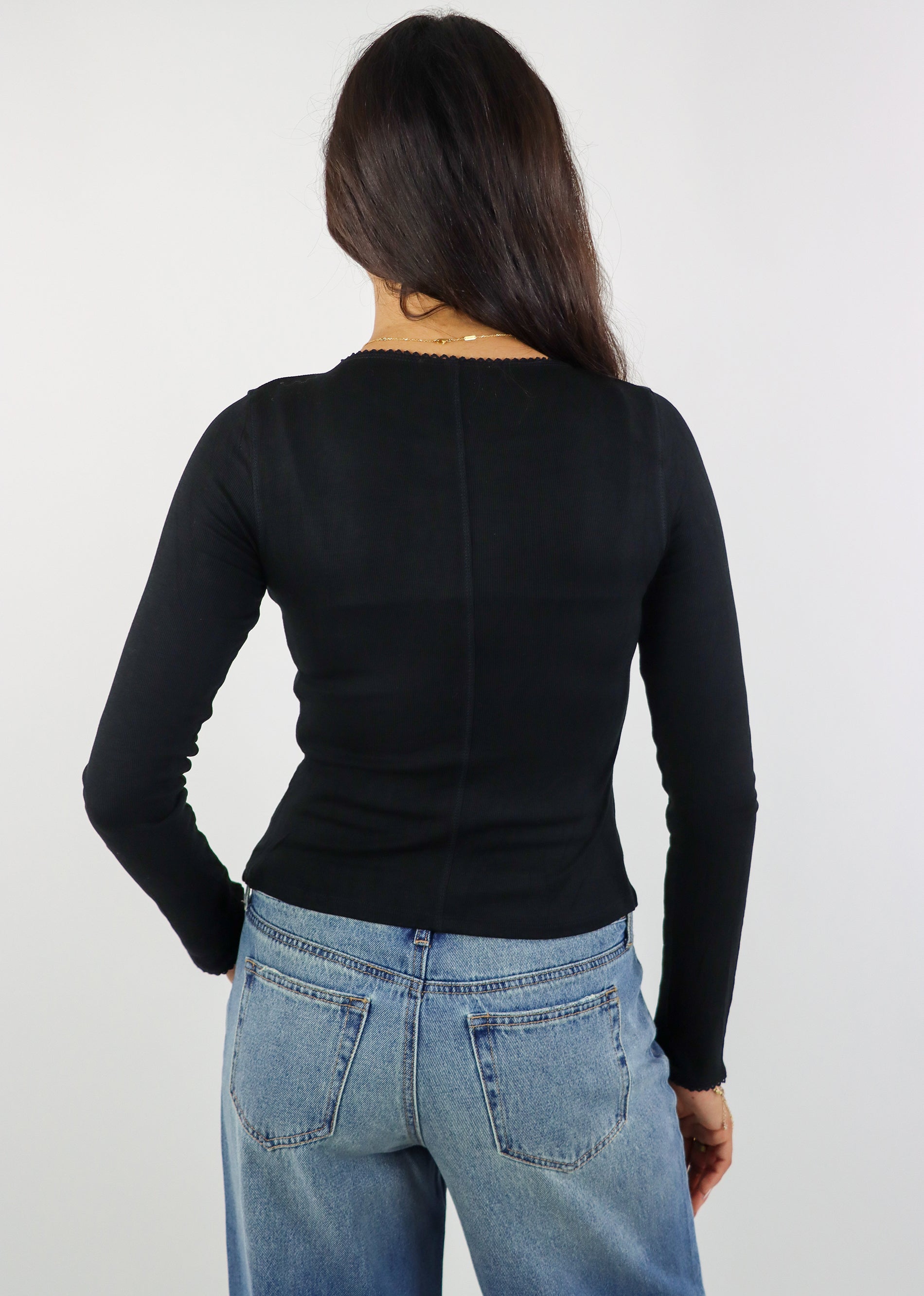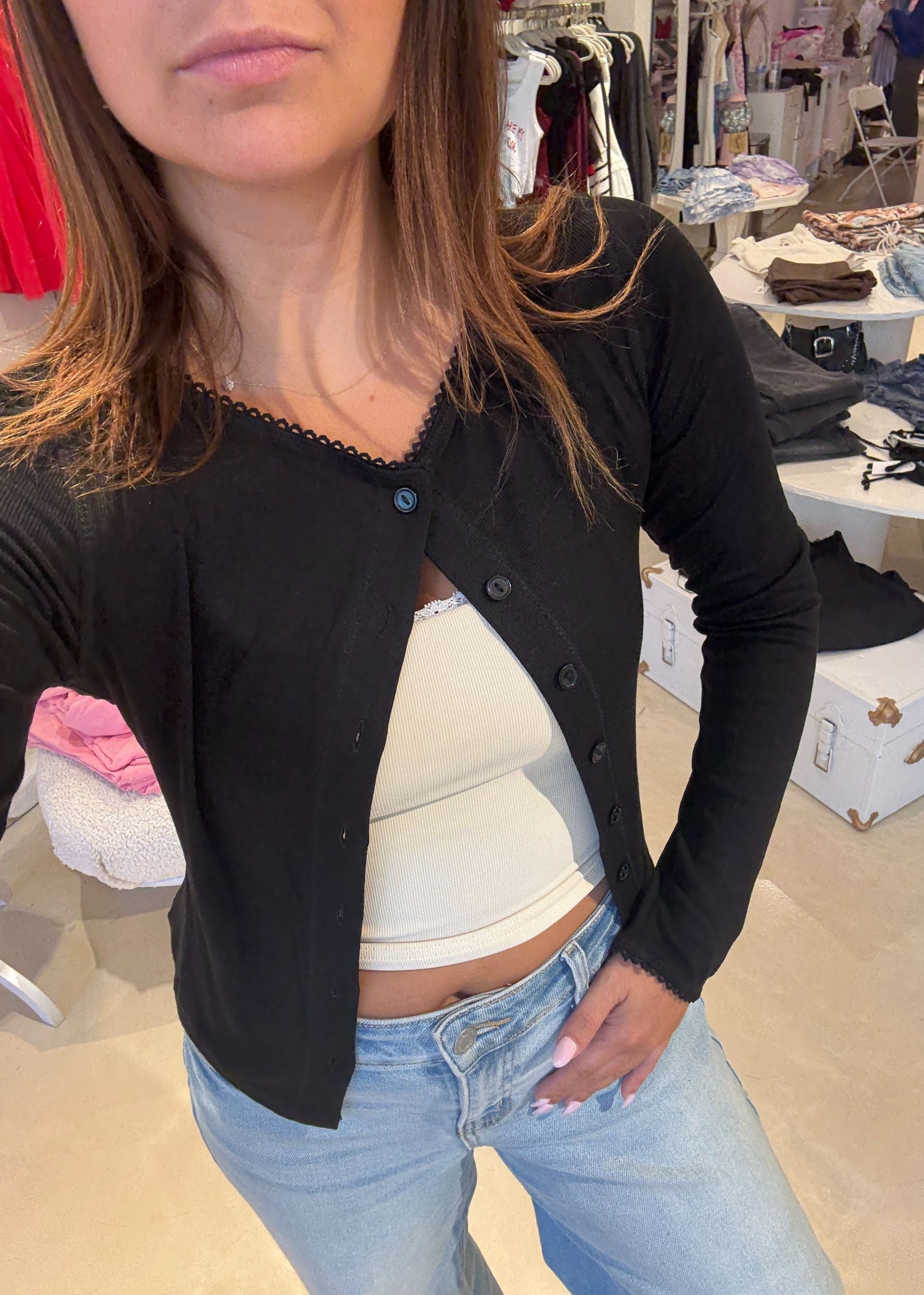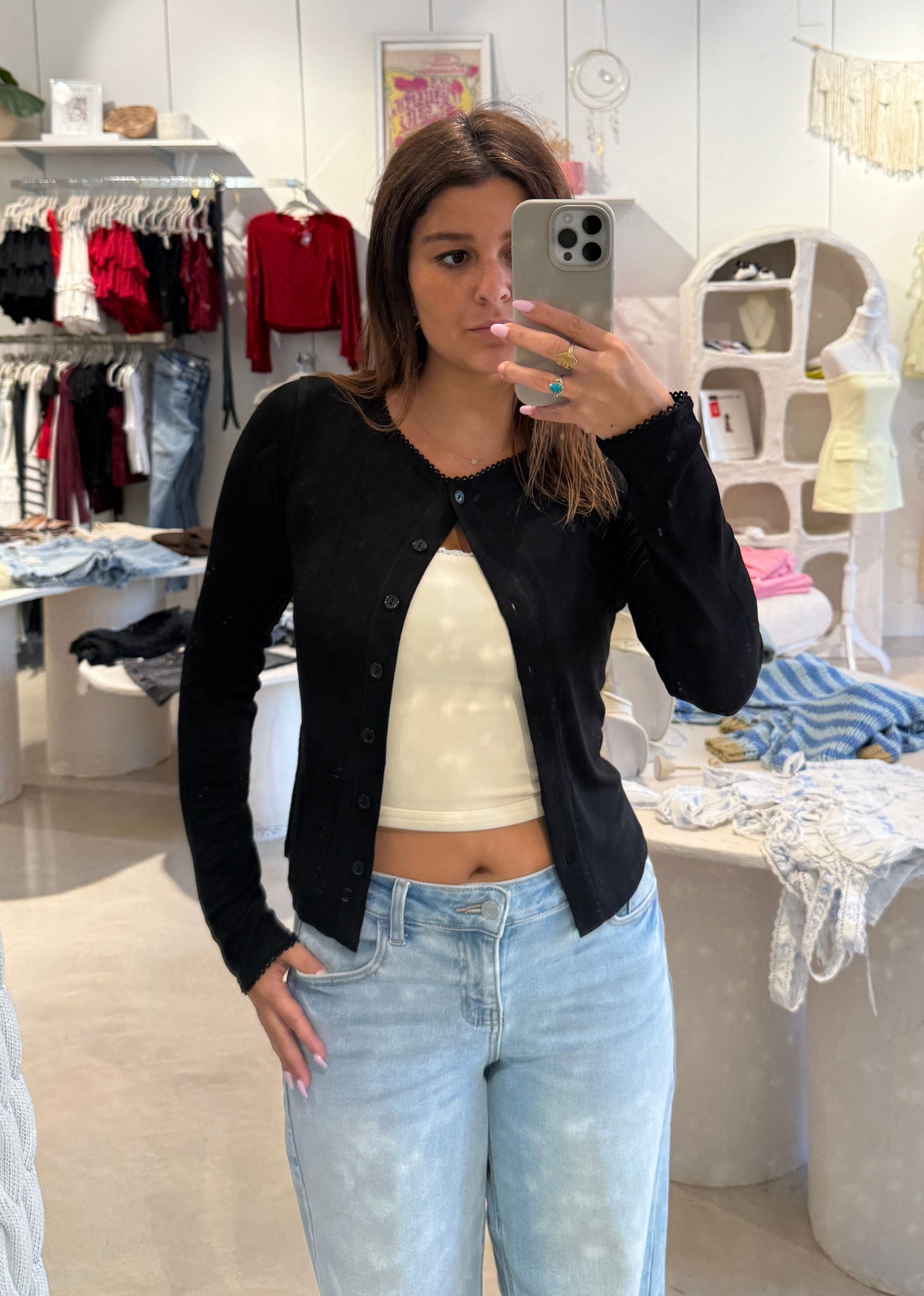 Chic, sleek, and endlessly versatile — this fitted full-length cardigan is the perfect layering piece. Designed with a flattering silhouette and delicate scallop trim, it balances timeless polish with a touch of feminine detail. Style it buttoned up as a top or left open over tanks and dresses for year-round wear.