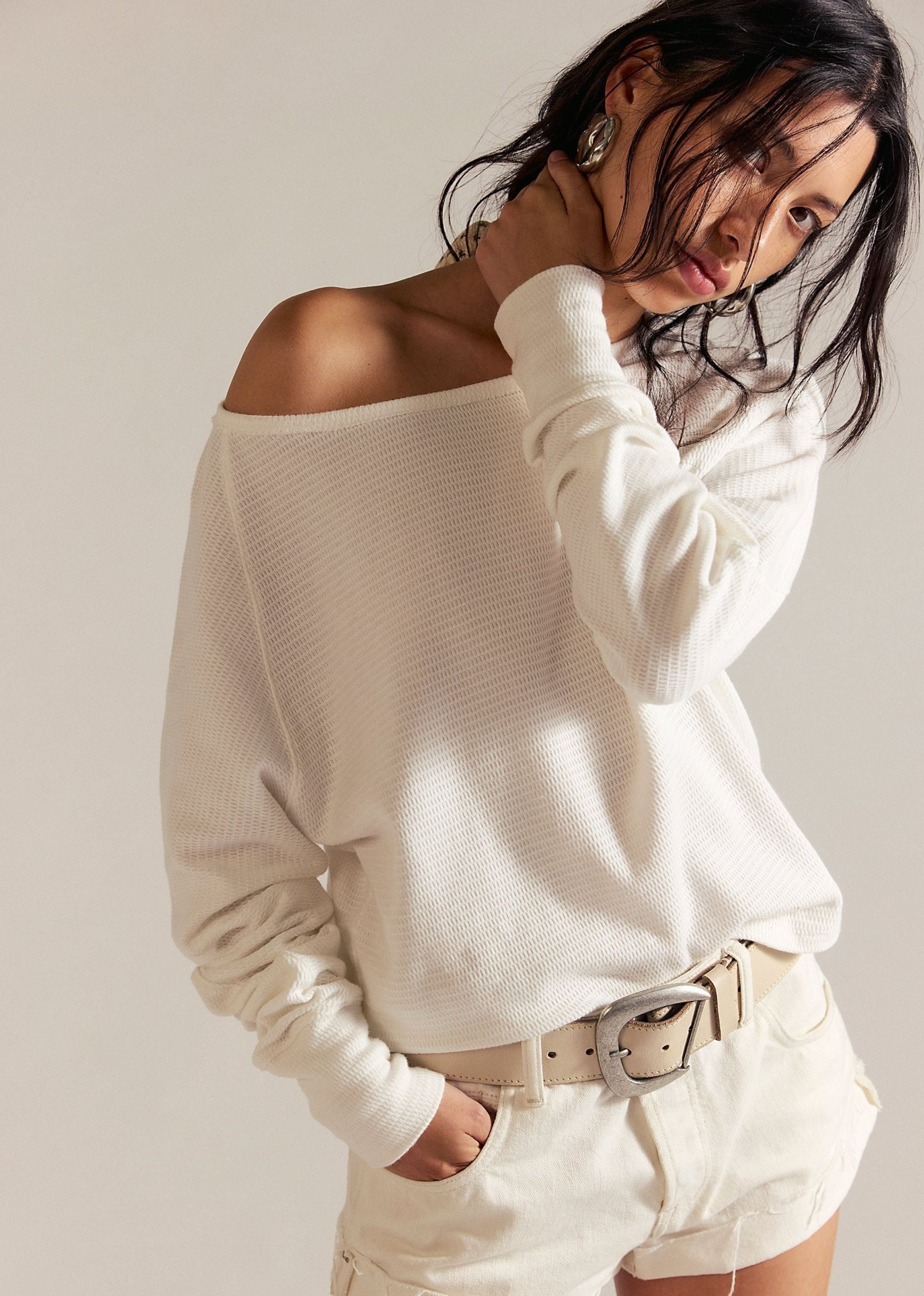 Cozy meets playful in this white cream thermal crop top, soft, warm, and made for chilly evenings or laid-back layering. Featuring a relaxed off-the-shoulder neckline with long sleeves, this crop top brings effortless style to your everyday rotation. Perfect with high-rise denim, a skirt, or styled under a jacket.