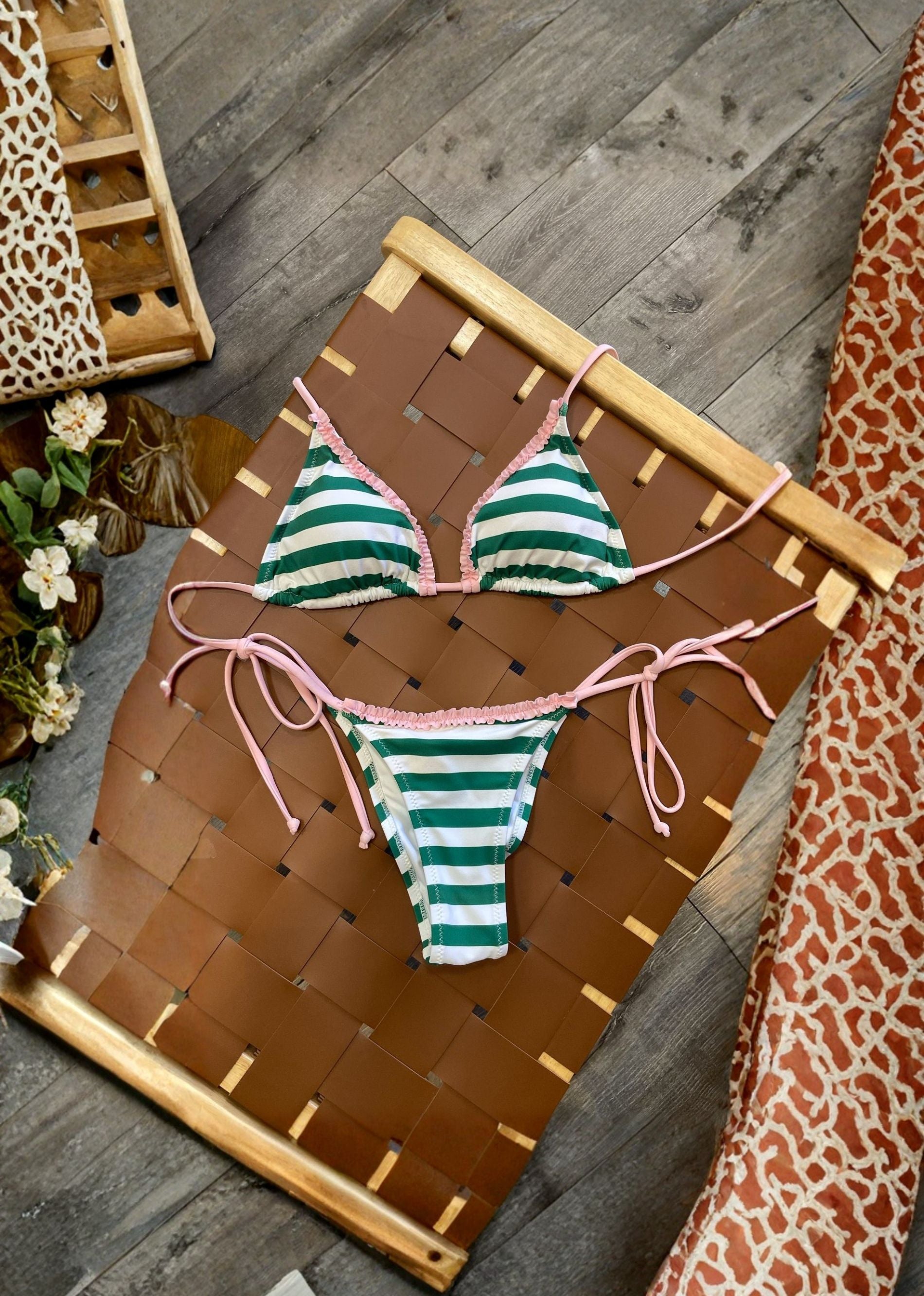 These green and pink striped bikini bottoms are a perfect match to the Fabulous Bikini Top. They bring a cute, throwback vibe that’s perfect for warm-weather days. Designed with adjustable side ties and contrast pink trim, they feature a cheeky fit that’s flattering, playful, and easy to wear. The vintage-inspired stripe pattern gives effortless cool-girl energy, making these bottoms a go-to for pool hangs, weekend getaways, or whenever you’re feeling a little nostalgic and fun.