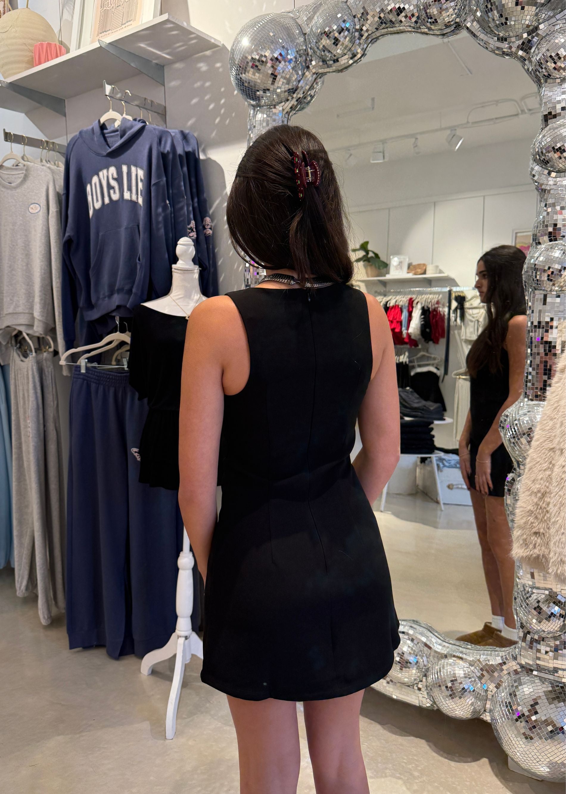 This black boat neck mini dress is effortlessly chic with a touch of modern sophistication. The wide neckline highlights your shoulders and collarbone, while the sleek, fitted silhouette flatters every curve. Perfect for date nights, special events, or evenings out, it transitions seamlessly from day to night with a quick change of accessories. Pair it with statement earrings and heels for an elevated, timeless look.