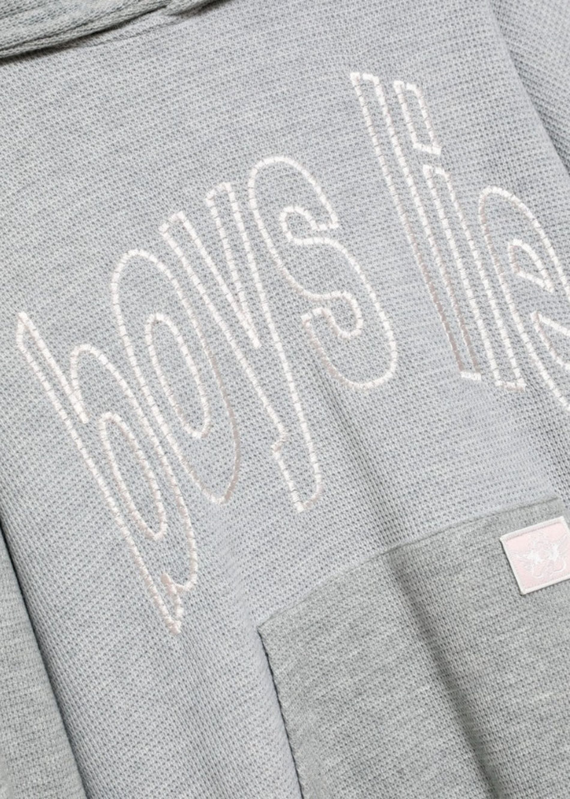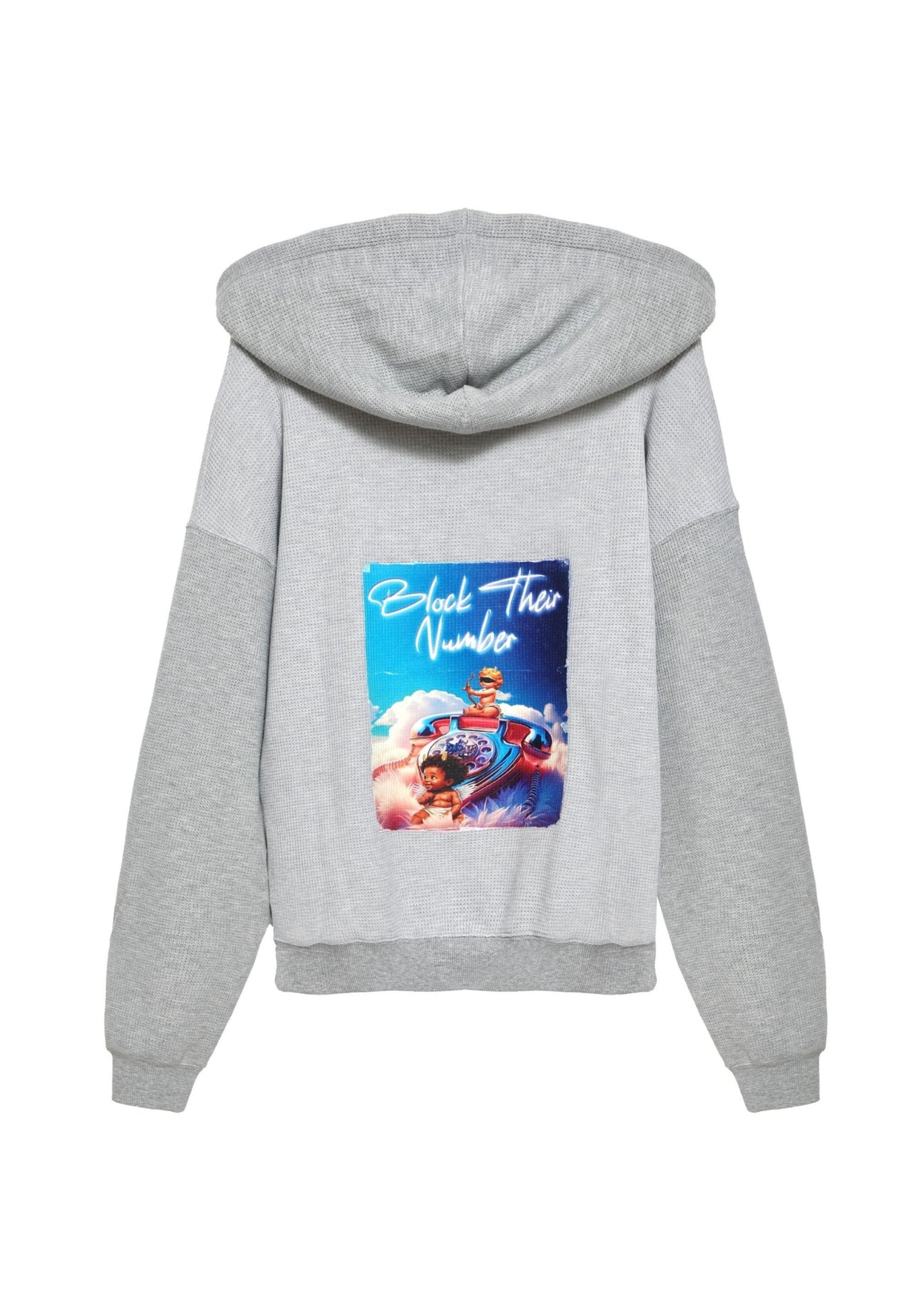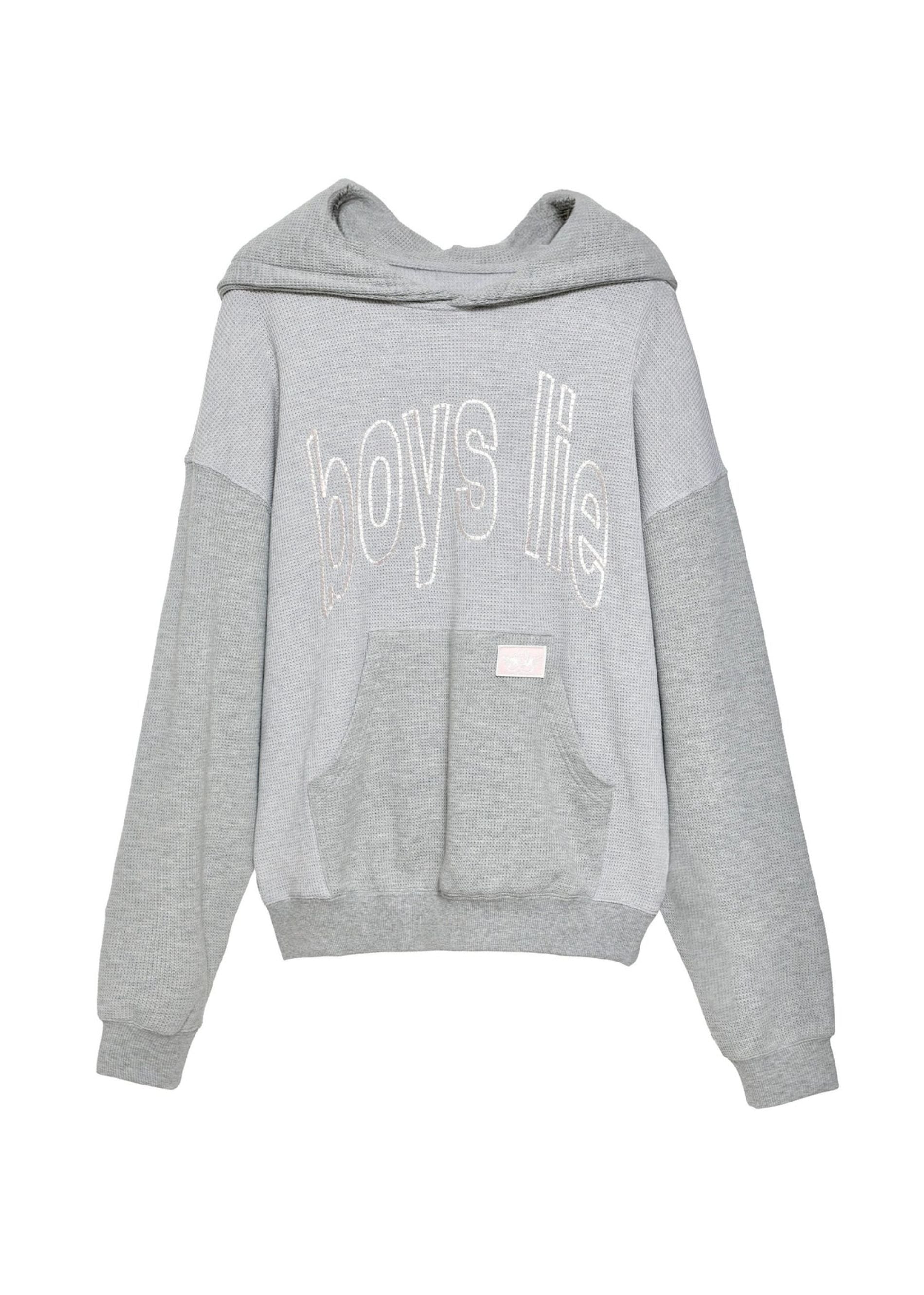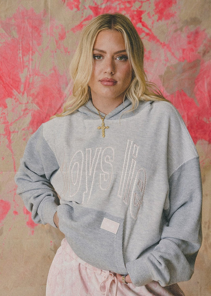 The Block Their Number V3 Racer Hoodie blends laid-back comfort with subtle edge. This grey thermal hoodie features a light grey body with slightly darker sleeves and hood for a tonal, layered vibe. A small patch accents the front pocket, light pink “Boys Lie” embroidery adds a pop of color, and a bold back graphic delivers that signature Boys Lie statement.