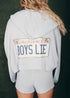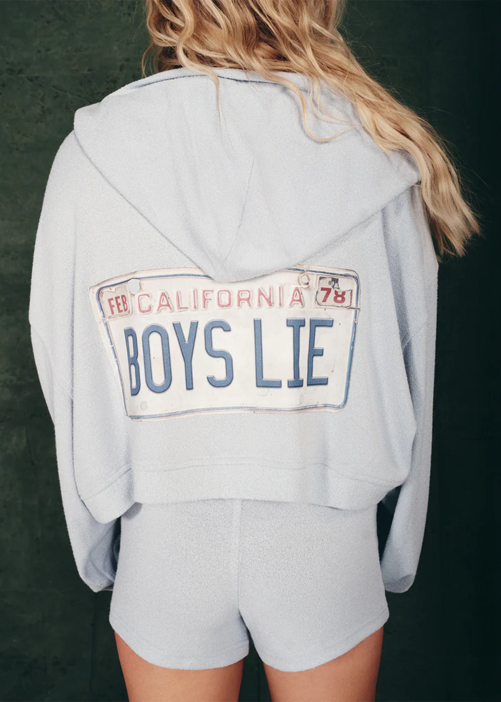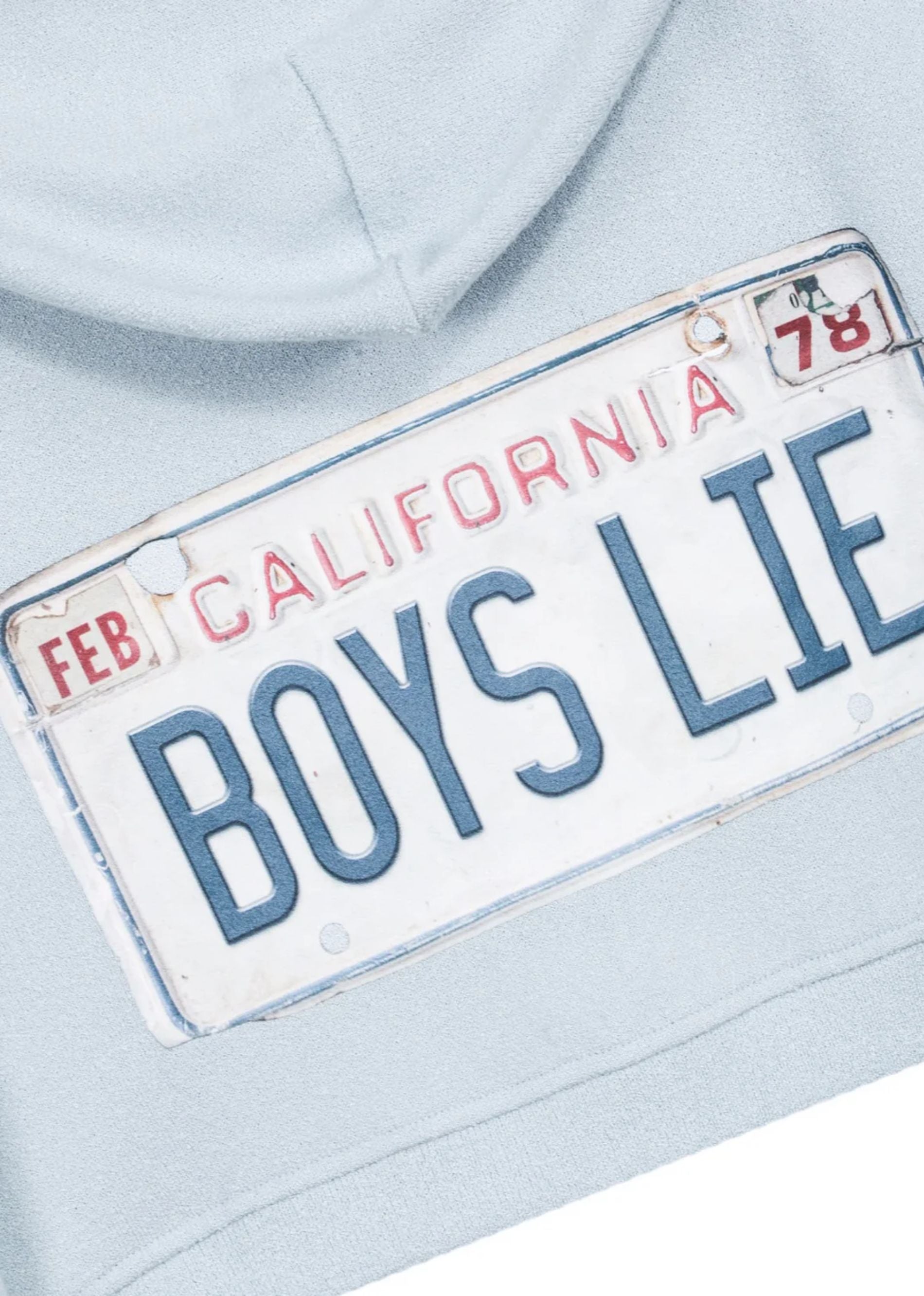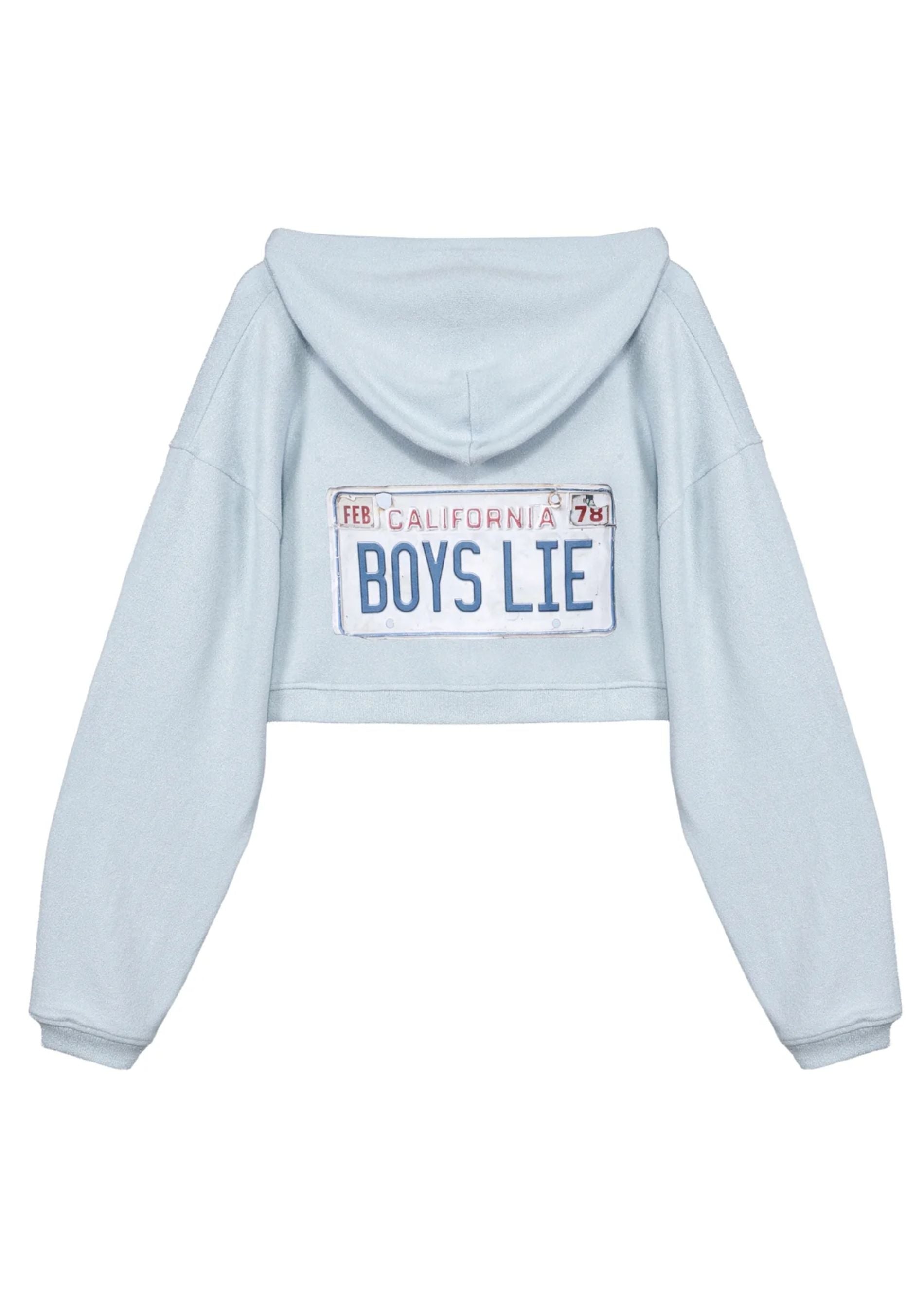 Back by popular demand. The Boys Lie Drivers License Zip Up Hoodie is crafted from soft baby bouclé fabric with a relaxed fit and cropped length for the perfect mix of cozy and cool. This light blue zip-up features a subtle cherub detail on the front, while the back showcases the vintage-inspired California license plate graphic with “Boys Lie” across the center. Easy to layer and effortlessly stylish, it’s the perfect throw-on piece for everyday wear. Complete the look with the with the Drivers License Micro Short.
