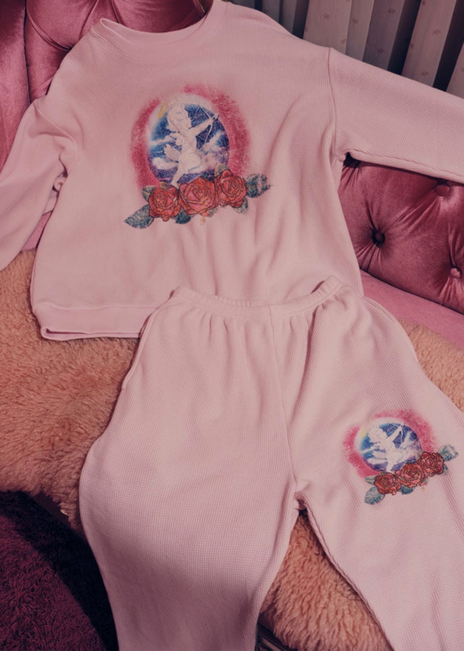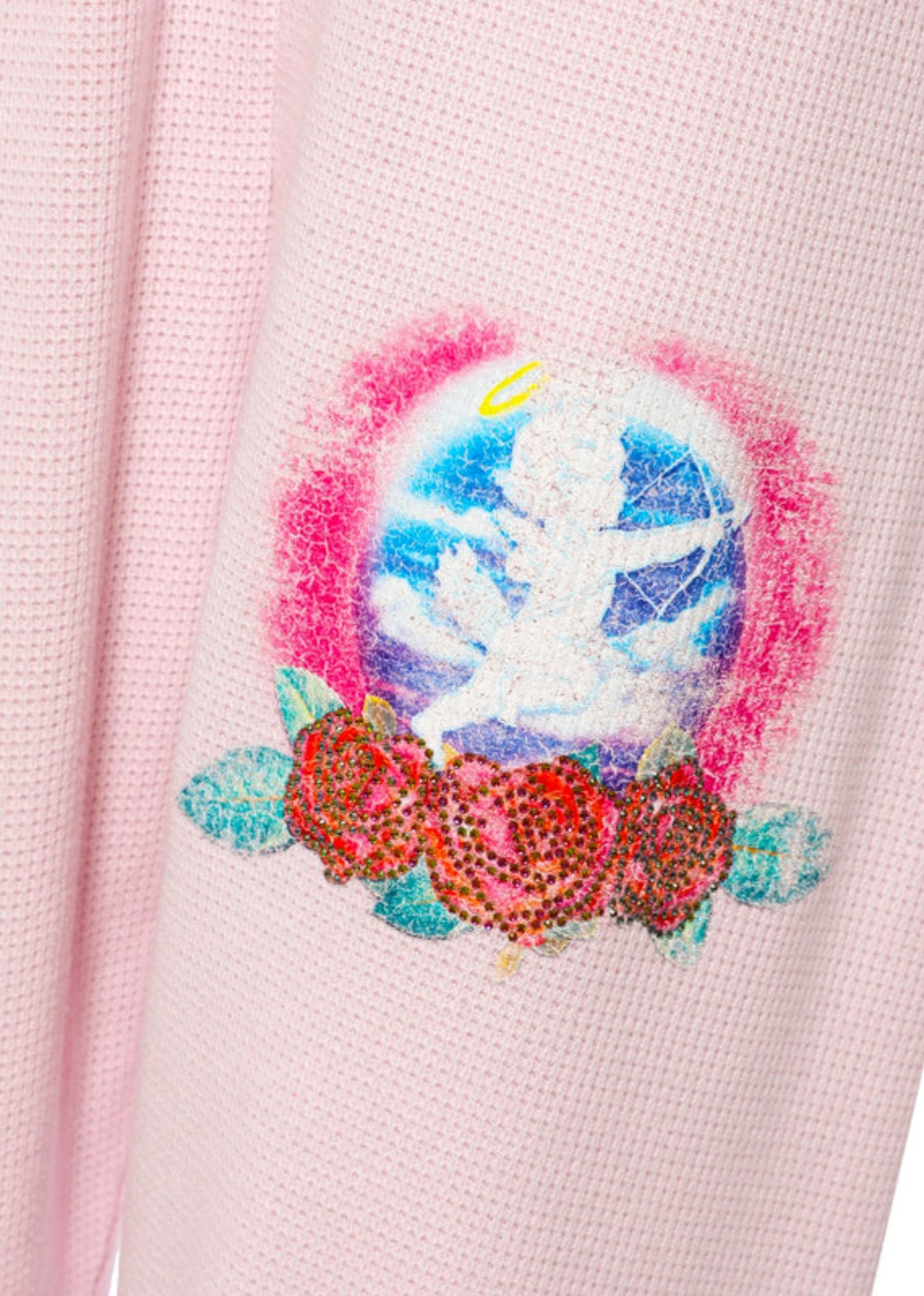 These Boys Lie pink sweatpants are the perfect mix of cozy and cute. Made from a pale pink thermal fabric with a soft, textured feel, they’re designed for lounging, layering, and living in your feelings (comfortably). A subtle Cupid graphic on the pocket adds just the right amount of detail, while the relaxed fit and elastic waistband keep things comfy and clean. Wear them solo or pair them with the matching top for the ultimate off-duty set moment.