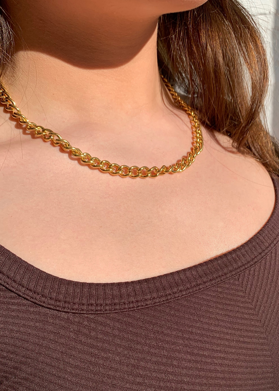 This chunky link necklace is absolutely perfect for layering. We love the more muted gold tone and think its the perfect addition of texture to a gorgeous necklace stack!