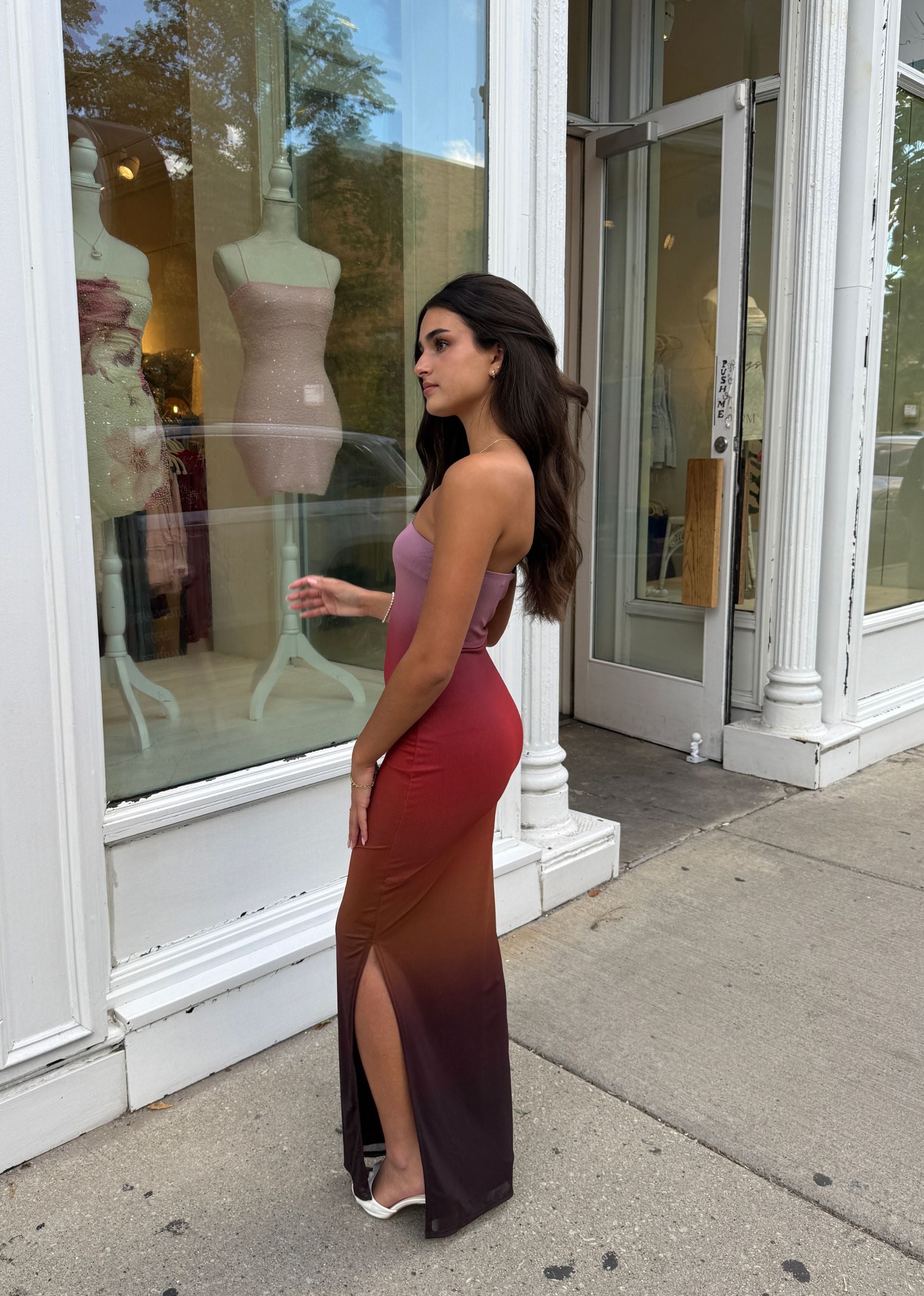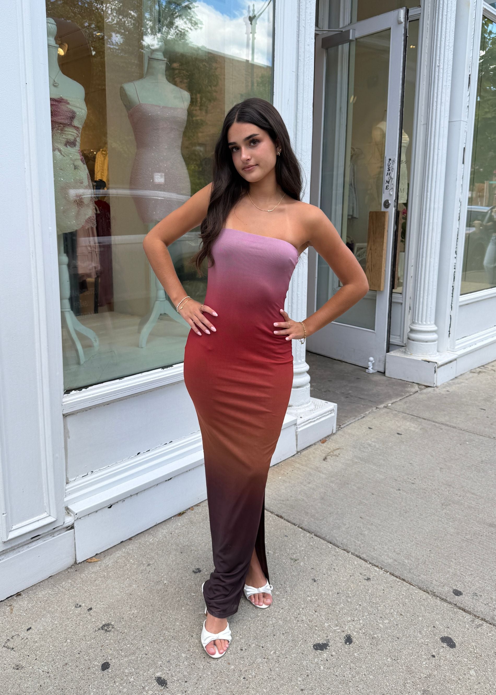 Bold, romantic, and ready for fall nights — the Falling Slowly Dress is a strapless ombre maxi with a bodycon silhouette that flatters every curve. Featuring a pink-to-red-to-brown gradient, this lightweight mesh design is fully lined for comfort and finished with a side slit for a touch of edge. The perfect dress for weddings, formal events, or when you want to turn heads.