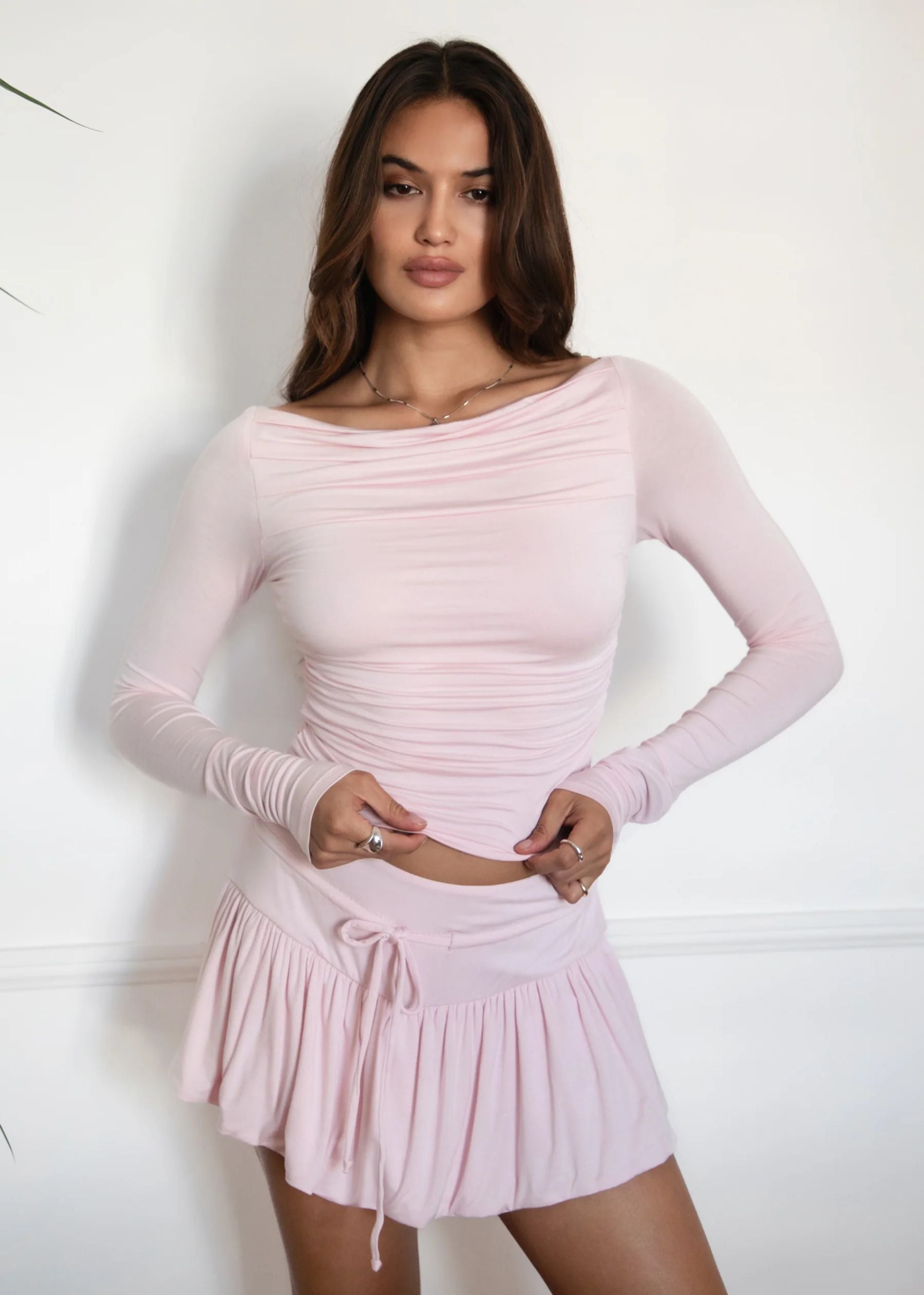 Soft, sleek, and effortlessly flattering, the Pink Skies Ruched Long Sleeve Top is your new everyday essential. Designed in a dreamy blush pink, this boat neck top features delicate ruching that hugs in all the right places for a smooth, sculpted fit. The buttery-soft stretch fabric makes it as comfortable as it is chic, perfect for layering or wearing on its own. Dress it up with a mini skirt or keep it casual with denim for an elevated, minimalist look.