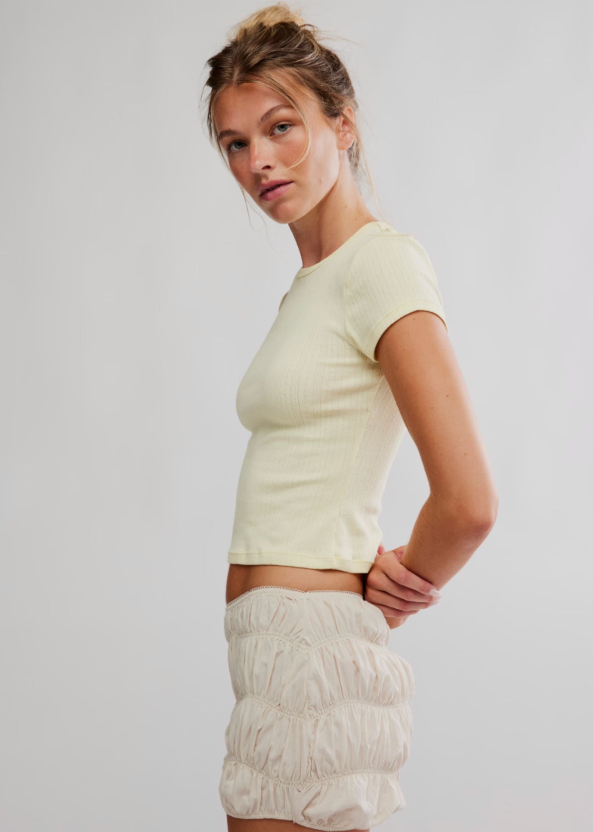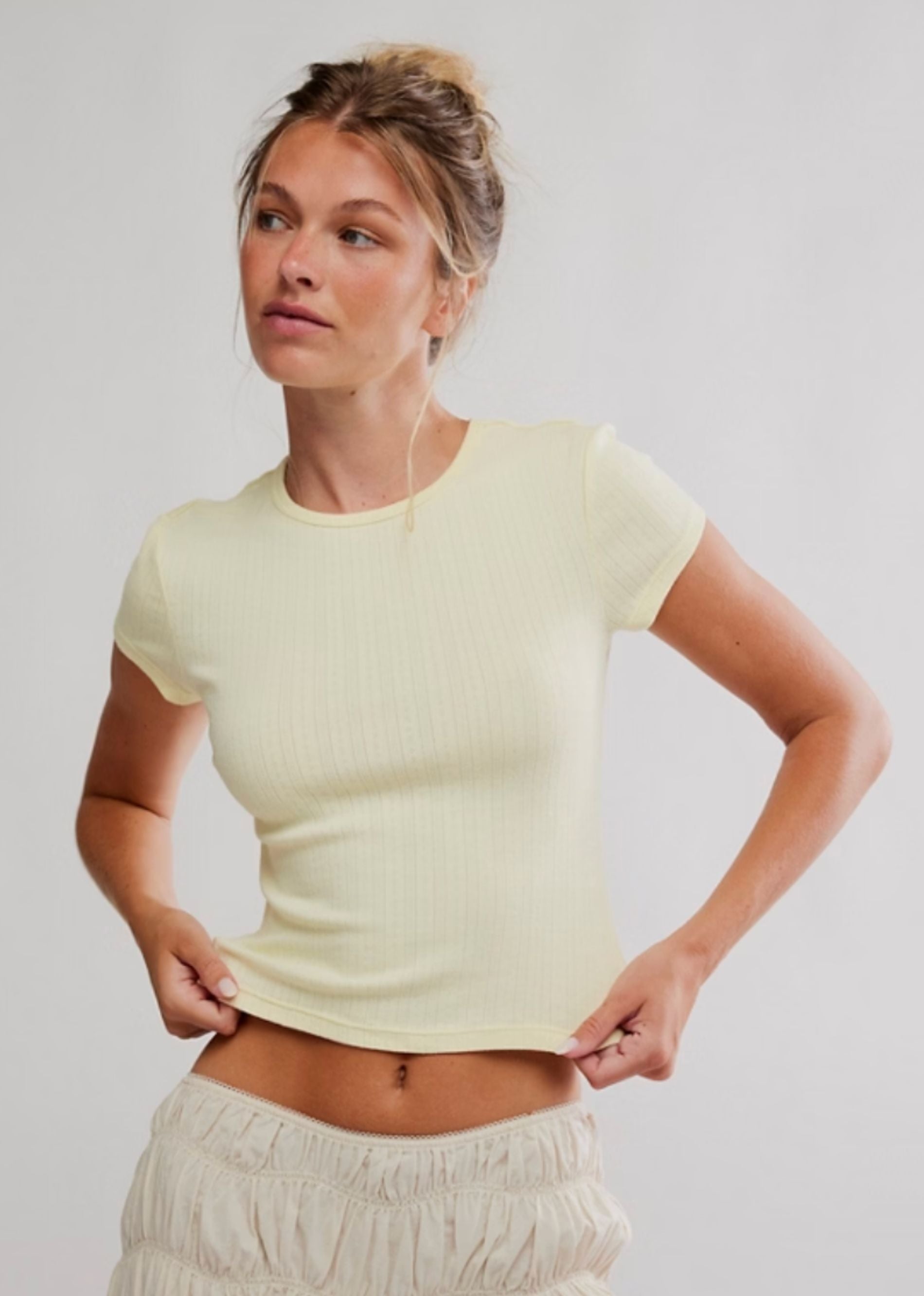 The sweetest everyday staple. The Wait A Minute Baby Tee from Free People is crafted in soft pointelle fabric with a flattering cropped fit and delicate cap sleeves. Finished in a dreamy butter yellow hue, this baby tee is perfect for layering or wearing solo with low-rise denim, skirts, or cargos. Easy, feminine, and endlessly wearable.
