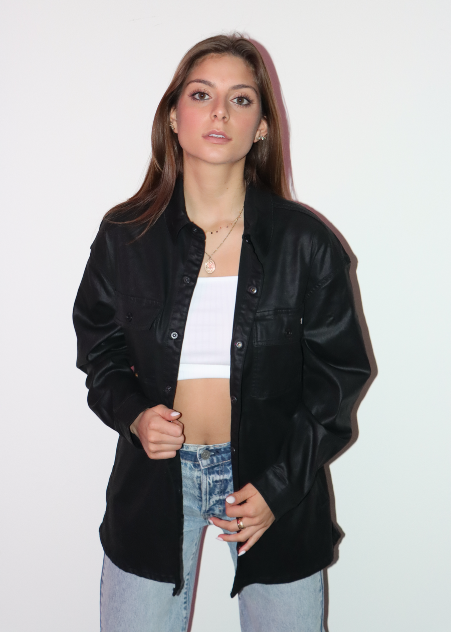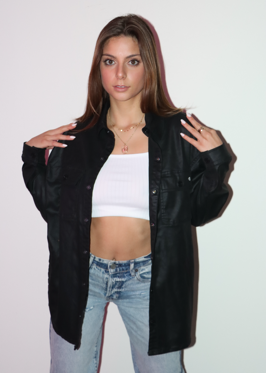 This shacket is perfect for layering over all your favorite pieces. It features a wax coated denim material with front pockets and a button up closure. Pair this with the matching pants for a trendy monochromatic look! You can also wear this with a mini skirt and tights for a transition between seasons. We know you will rock it!
