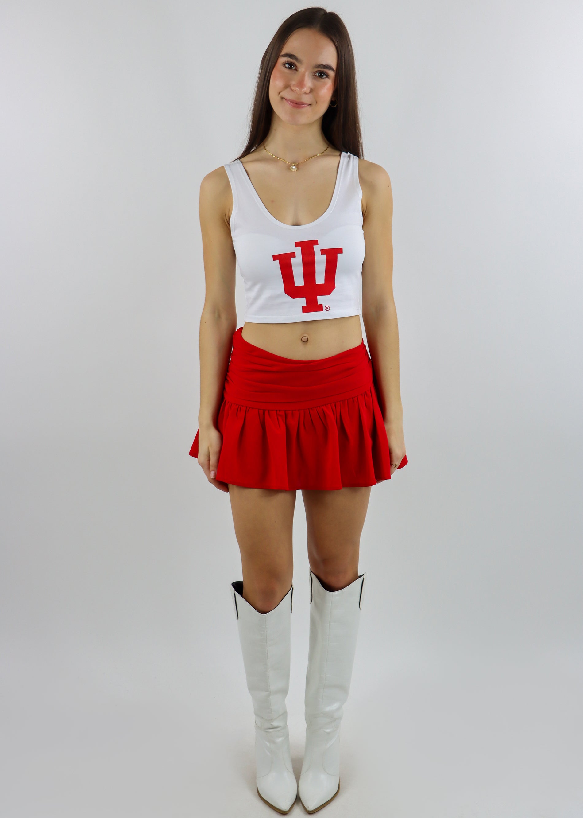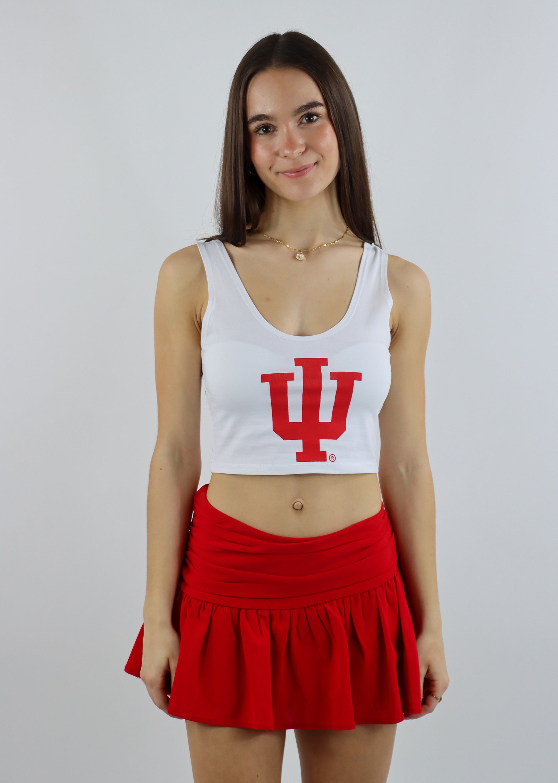 Show your Hoosier pride with this white Indiana University cropped tank, featuring the iconic red Indiana trident logo front and center. With its clean design and bold pop of school spirit, this tank is perfect for game days, tailgates, or sunny campus strolls. The cropped fit adds a trendy twist, while the soft, breathable fabric keeps you comfortable all day long. Pair it with high-waisted shorts, jeans, or a sporty skirt for an effortlessly cool, collegiate look.