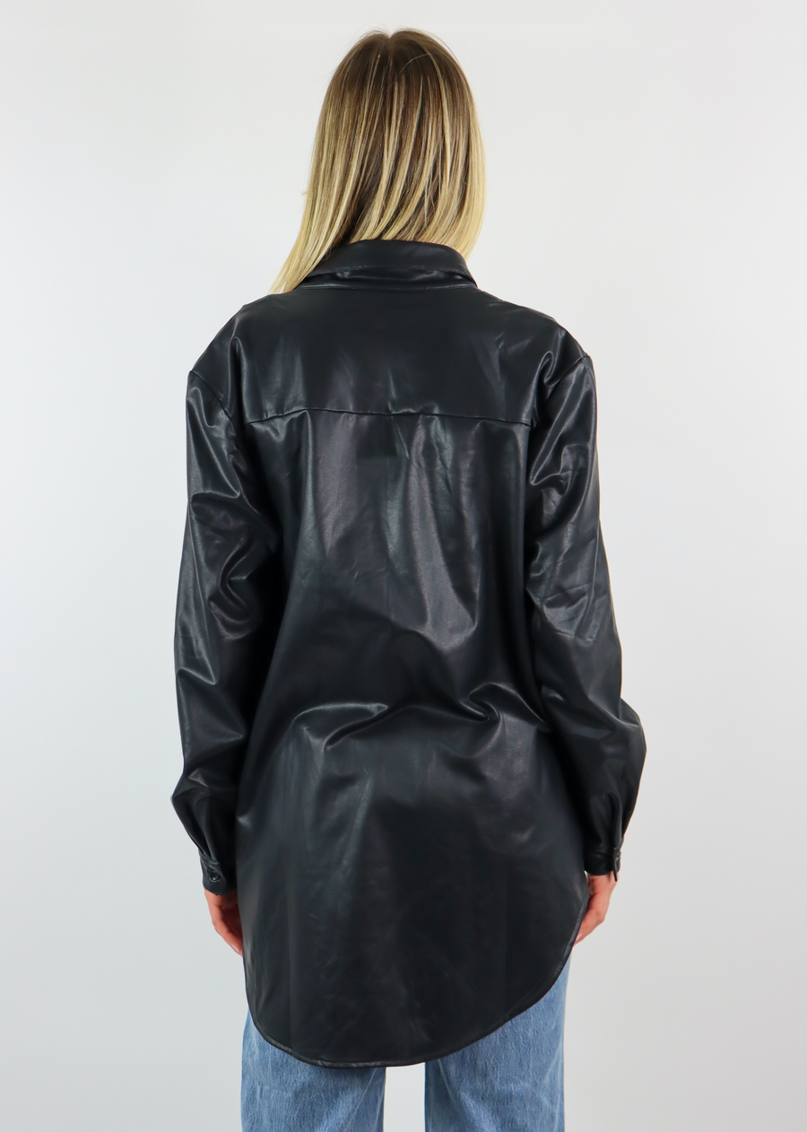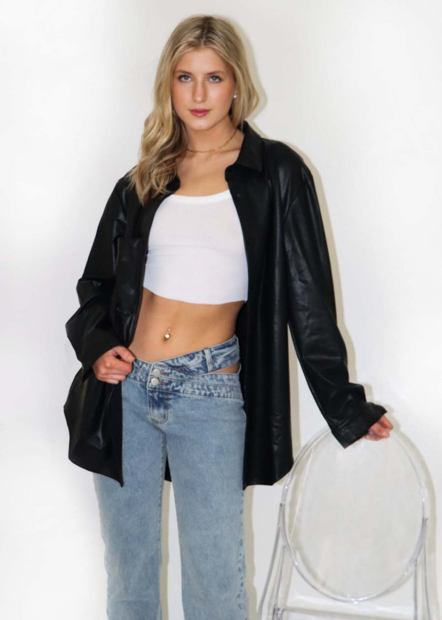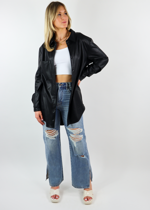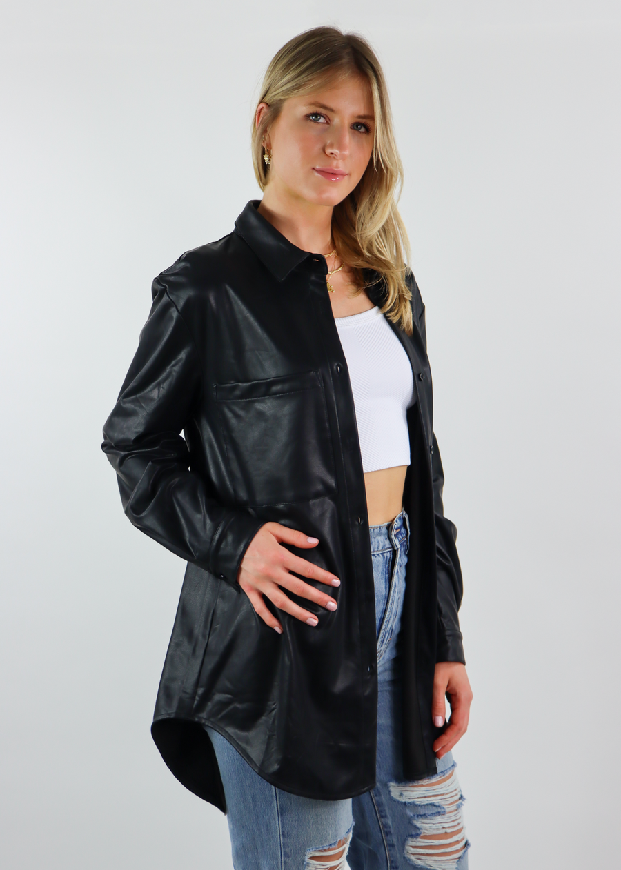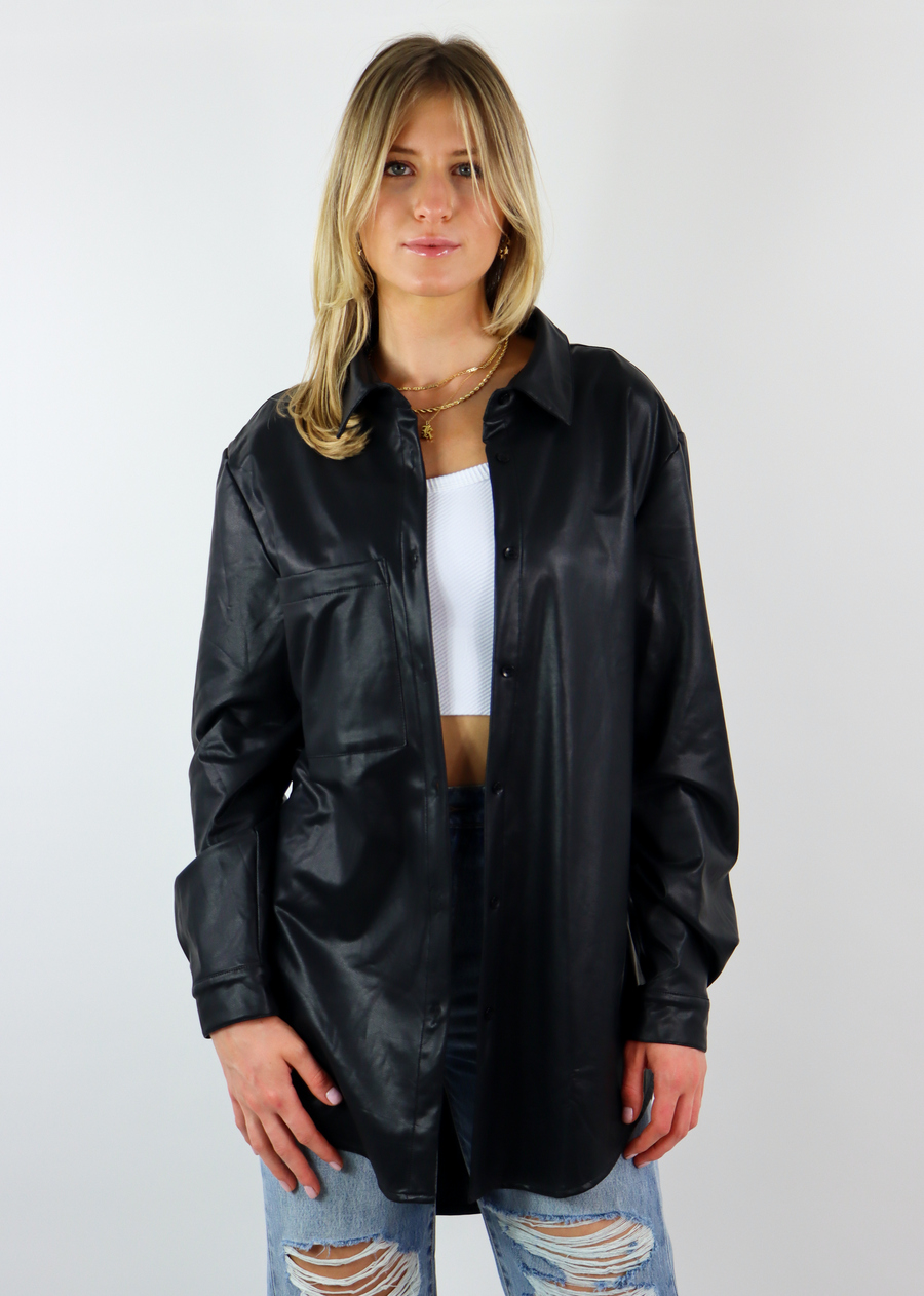 This leather shacket is our new obsession! The Lost Me Shacket features a comfy oversized fit and a front pocket on the right. This shacket is the perfect light-weight jacket for fall weather. Style this with a classic high neck tank and some Mom jeans for a classic look!