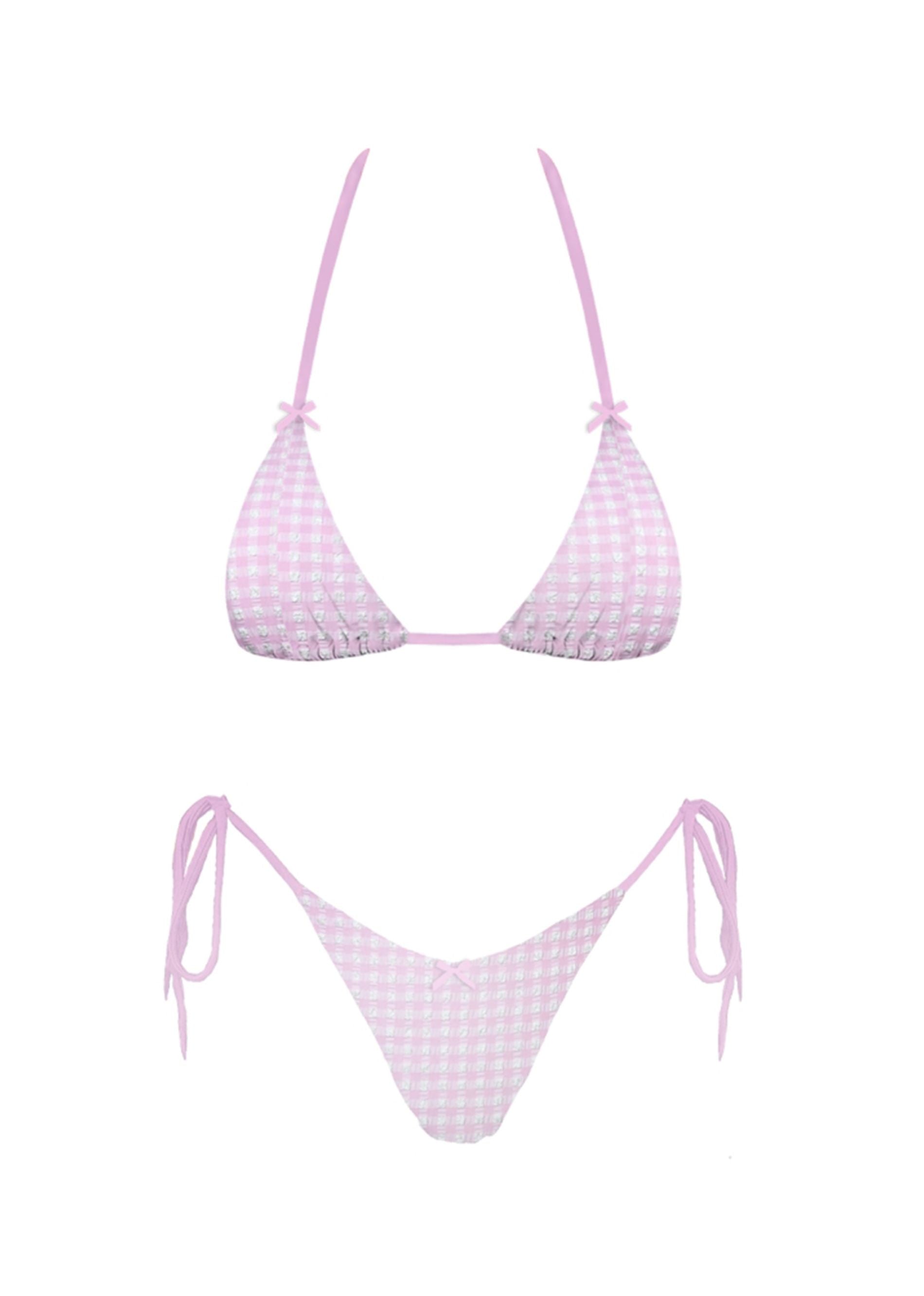Channel soft girl summer in the Sweetheart Gingham Bikini Top. This triangle halter top features a dreamy light pink gingham print with the cutest matching bow detail at the center. With adjustable ties at the neck and back, you can create your perfect fit for every beach day, pool party, or vacay adventure.